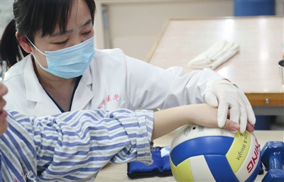 “好好好,放松,回来,好,成功,又得了20分!”康复治疗师乔晓果正在帮助因脑出血导致左侧偏瘫的何女士进行康复训练。她特别耐心地帮助何女士一次次把左手搭在一个干净的足球上,让她慢慢学着激发胳膊肘和手腕的力量控制左手不从球上掉下来,同时还逐个给何女士的手指按揉,让何女士尝试用手指去控制球。记者发现,何女士的手掌目前可以在足球上撑一会儿,她很配合乔老师的指令,也很欣喜自己在短时间内就可以取得的小小进步。“之前是在一家比较有名气的康复中心做训练,但是不适应那边的治疗方式,训练了两个月没多大效果,我都快抑郁了,所以爸妈就考虑想换一家,这边离家近,光看表面的确不太光鲜,但是父母提前过来考察过,感觉治疗技术还有医生技师们都很好,所以就带我过来试了。”何女士对记者侃侃而谈:“没想到康复效果会这么明显,来这边两周不到,才刚上了八九次课,我的胳膊肘已经能伸直了。老师教得非常好,一步步教我怎么发力、怎么控制、怎样激活手指末梢神经,遇到个好老师很不容易,我现在每天都有进步,能看到康复的希望了!”