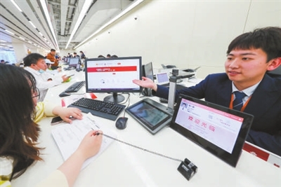 企业服务窗口统一集中至北侧区域,并创新开设高效办成一件事服务区、金融服务区和特色服务区,这一改变缩短企业办事人员寻找窗口的时间,提升办事效率。记者注意到,高效办成一件事服务区设立的“1对1指导”窗口尤为亮眼,采用“双面屏”交互窗口,企业申报与工作人员指导受理实时同步,申报效率大幅提升。