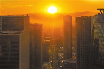 9月22日18点10分落日时刻,秋分时节的落日悬于远方西山,金黄色的余晖穿过骆驼湾街,将丽泽金融商务区点缀得熠熠生辉。几分钟后落日从地平线落下。 姜灏 文并摄