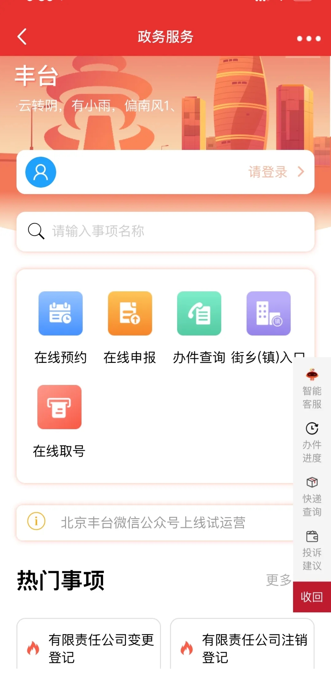 第一步:关注“丰政通”公众号,通过公众号的“我要办事-掌上大厅”进入丰台区政务服务掌上办事大厅首页,选择“请登录”。