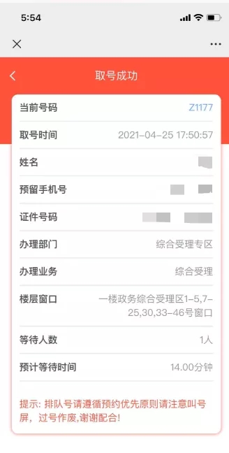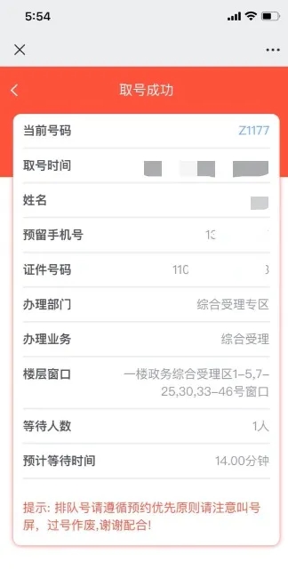 “在线预约”可预约次日起五天内五个时间段的号源,预约成功后系统后台会生成一个预约码,办事人员需在取号机上选择“我已预约”,扫描身份证或者通过人脸识别完成现场预约取号,随后等待叫号便可办理业务。