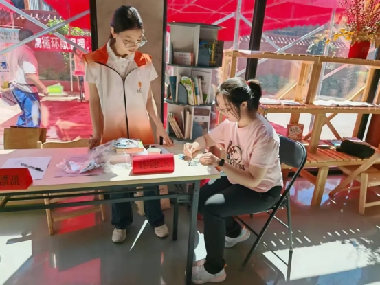 7月17日上午,在丰台区成寿寺街道方南家园社区睦邻小院内,一场集便民服务、文化体验与志愿互动于一体的“爱邻”便民服务日如约而至。为了丰富活动内容,提升居民参与体验感,本次活动除了开放室内两个区域以外,志愿者们提前还在小院内搭建起了红色的大帐棚,形成一块防晒的活动区域。