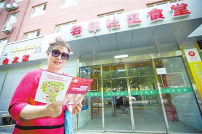 新宫家园的老年社区食堂门前,居民正在查看南苑街道推出的“养老美食地图”。赵自谦 摄