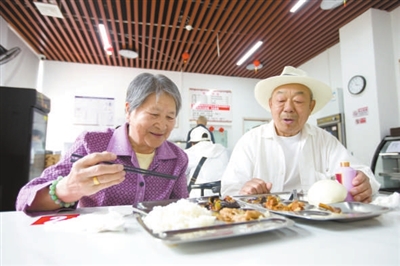 槐房村幸福晚年驿站养老助餐点内,一对老夫妇享用午餐。赵自谦 摄