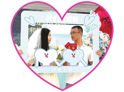 同时,丰台区民政局与北京婚姻家庭建设协会联合,在婚姻登记大厅特别设置了带有“七夕·爱的告白”主题的拍照背景板。心形背景板以红色为主色调,上面写满了幸福誓言,这里也成为新人们选择拍照的热门场地。