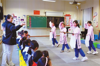 日前,在长辛店国潮时尚街区举办的“外交官看中国·一区一品”活动中,太平桥学校戏曲特色社团带来的《定军山》《扈家庄》《钓金龟》《铡美案》戏曲选段表演赢得了中外宾客的阵阵掌声和叫好声。自2014年成立以来,社团发展至今已涵盖生、旦、净、丑各个行当足有80人,从稚气未脱的小学一年级新生到沉稳练达的初中生,孩子们凑在一起组成了一个有模有样的戏团。文/记者 李娜 实习记者 袁阳 (详见04版)