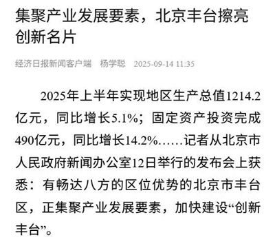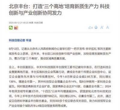 中国经营报客户端发布《每8分钟就有一家科技企业诞生在丰台》报道:近年来,丰台区坚持以科技创新引领产业创新,着力打造科技企业集聚、新兴产业发展和科技服务赋能“三个高地”,加快培育和发展新质生产力。