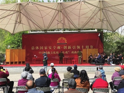 “适才听得司令讲,阿庆嫂真是不寻常,我佩服你沉着机灵有胆量……”走进园内和平广场,一曲曲耳熟能详的红色唱段响起,由丰台区文创中心推出的“总体国家安全观·创新引领10周年”戏曲演出正在进行。活动将区域戏曲文化特色与国家安全宣传教育相结合,通过《军民鱼水情》《智斗》《打虎上山》等红色经典剧目选段,进一步营造浓厚的宣传氛围。