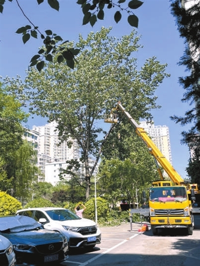 用清理杨絮的方法消除对车辆的伤害,终究治标不治本,今年5月,吴顺启开始向社区反映杨絮问题。吴顺启多次来到社区提出相关诉求,社区积极为居民协调,最终请来了区园林绿化局工作人员,为老杨树进行专业“理发”。