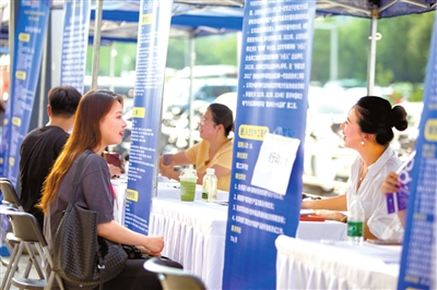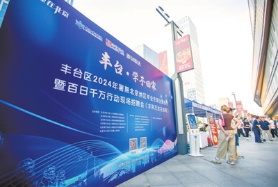 本报讯(记者 林瑶 通讯员 朱睿婕)7月26日下午5点,位于中关村丰台园的丰科万达广场人流多了起来,热浪逐渐褪去,商场北侧广场上数十家招聘展位一字排开,前来咨询应聘的求职者络绎不绝。