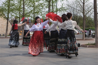 居民在家门口的公园排练舞蹈。赵自谦 摄