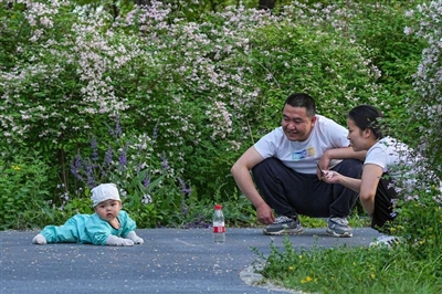 家长在公园内引导孩子练习爬行。欧阳树辰 摄