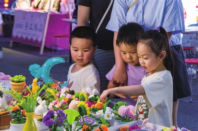 小朋友在花朝街夜市挑选喜欢的手工艺品。