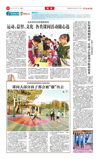 在操场上进行集体操练、分组跳绳扔沙包,在楼道里跳房子、玩萝卜蹲,在教室里玩象棋、做数独……今年8月13日北京市教育委员会印发了《优化全市义务教育学校学生在校作息时间安排指导意见》,要求全市义务教育学校原则上落实15分钟课间时长。更长的课间怎么玩?丰台的学校有哪些小创意?孩子们感受如何?近日,记者先后到辖区几所学校进行探访,发现不少学校的课间活动凝聚了老师和同学们的巧思,让孩子们感觉很nice。