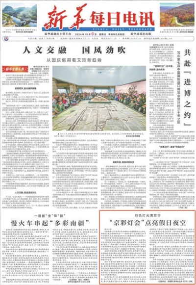《新华每日电讯》2024年10月6日头版刊发《“京彩灯会”点亮假日夜空》:天色渐暗,位于京西永定河畔的北京园博园内灯火灿烂,京城史上最大规模的灯会——“京彩灯会”9大主题区200多个灯组同步点亮。丰台区还推出夜游推荐指南、餐饮消费路径、金秋游览线路等“攻略”,依托“京彩灯会”打造文商旅融合的北京文化新地标和夜经济新场景。