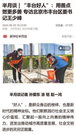 《半月谈》2024年第16期刊发《“丰台好人”:用善点燃更多善 专访北京市丰台区委书记王少峰》:“好人”选树与城市高质量发展同心同向。