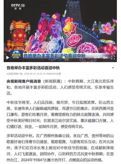 中央电视台《新闻联播》栏目2024年9月15日播发《各地举办丰富多彩活动喜迎中秋》:北京园博园,占地630多亩、设置了10多万件特色灯具的“京彩灯会”亮相,灯会融合了自贡彩灯技艺和京味京韵,设置“节日欢歌”“锦绣河山”等九大主题展区。