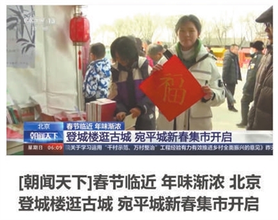 中央电视台《朝闻天下》栏目2024年2月4日播发《春节临近 年味渐浓 北京登城楼逛古城 宛平城新春集市开启》。
