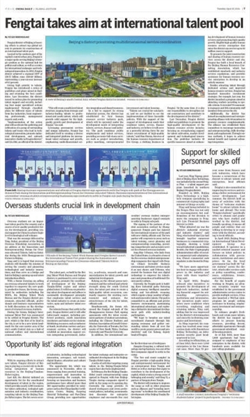 《中国日报》2024年4月30日整版刊发《Fengtai takes aim at international talent pool》英文报道。
