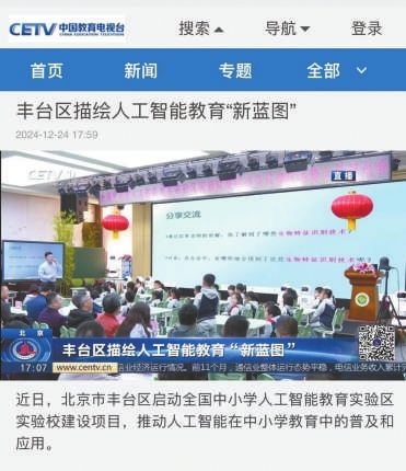 ●中国教育电视台2024年12月24日播发《丰台区描绘人工智能教育“新蓝图”》:北京市丰台区启动全国中小学人工智能教育实验区实验校建设项目,推动人工智能在中小学教育中的普及和应用。