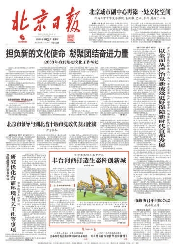 《光明日报》2024年1月2日整版刊发《构建彰显新时代首都发展的城市新形态——北京市丰台区系统化推进城市更新的探索实践》:丰台区的城市更新行动——推动传统商圈向现代产业转型,蝶变的大红门延续中轴文脉;用设计与创意让长辛店老镇重拾繁盛;片区类城市更新实践梯次进行,“40岁”的方庄社区活力再现。