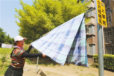 由于树木遮挡、户型等原因,南苑街道有些小区部分居民家里日照时间不长,晾晒衣服和被褥成为难题。有的居民把小树当成晾衣架,有的居民在楼前栓绳晒被子,还有的居民干脆把褥子铺在健身器材上……小区内“私拉乱挂”现象大煞风景,既影响环境美观、文明形象,又影响道路畅通,“晾晒难”问题成为困扰居民的“心头病”。