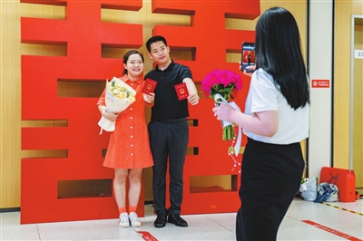 本报讯(记者 袁阳 通讯员 张洁莹)5月20日清晨,丰台区政务服务中心婚姻登记专区前早已排起长龙。在“520”这个被赋予浪漫寓意的日子,区婚姻登记事务中心以“丰华正茂 为爱告白”主题系列婚姻家庭文化活动,为预约的341对新人铺就通往幸福的“鹊桥”。