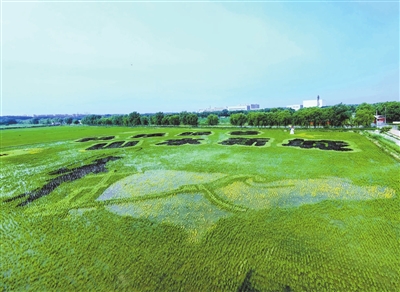 6月25日是全国“土地日”,记者在王佐镇佃起村金岗盛兴度假庄园看到,盘旋的白鹭、低飞的蜻蜓和绿油油的稻田,最吸引人眼球的还是巨幅稻田画。据了解,5月份,10名工作人员用黄色、白色、紫色稻种耗时20天的时间,绘制了“科技绿谷 山水新城”和老农牵着水牛耕地的稻田画,每个字大约400平方米,整幅稻田画1.8万平方米,将在7月中旬进入最佳观赏期。文并摄/赵智和