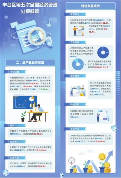丰台区秉持依法、科学、为民普查的理念,在普查过程中求真务实、改革创新,力求让每一组数据都精准反映经济发展的真实面貌。普查成果斐然,从多个维度呈现出丰台区经济发展的新态势、新成就。