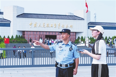 前来参观的不只是来自全国各地的观众,还有不少丁黎亮辖区的居民,看到丁黎亮,每个人都热情地和他打招呼,“老丁,在这儿又碰到你了。”“今天抗战纪念馆恢复开放,客流量大,我们过来维护秩序,做好服务。”丁黎亮一一回应后,继续向姜钧友讲解着抗战纪念馆的点点滴滴。