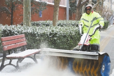 丰台环境科技有限公司通过优化作业模式、调整融雪剂使用策略,在保障出行安全的同时最大限度减少对环境的影响。环科负责区内道路1401条,总长970.91公里,其中734条道路通过“滚刷+雪铲”分段编组等方式,有效降低了融雪剂用量。对于背街小巷,则增加便携吹雪设备,实施精细化作业。丽泽路桥附近,一台特别的车辆正缓缓行进。它形似常见的道路清扫车,但车尾处多了一个方形装置。那是一个新加装的大功率吹风筒,正发出低沉而持续的嗡鸣。“这是我们今年的一项小创新。”相关负责人介绍,“这些车原本是扫地专用的,改装一下就能兼职扫雪了。”他指向车后的风筒,“原理不复杂,就是用高速气流直接把步道上的浮雪吹走,省去人工清扫,也减少融雪剂的使用。”