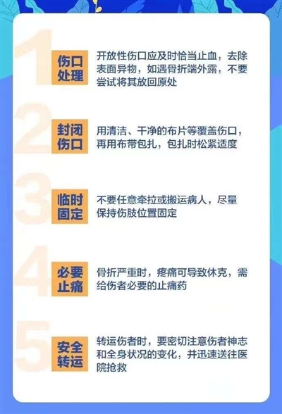 不管发生哪种骨折,用什么方法处理,急救的时候都需要遵循伤口处理、封闭伤口、临时固定、必要止痛、安全转运这五大急救原则。