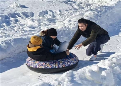 在上林湖冰雪嘉年华核心体验区内,多种解锁冬日快乐的娱乐项目也正在同步进行。雪地摩托区内,游客们佩戴头盔、握紧车把,在赛道上风驰电掣,轮胎碾过积雪溅起阵阵雪雾,上演冬日版的“速度与激情”;雪地坦克区内,不少游客驾驶着迷你坦克开启“冰雪征服之旅”,坦克履带压出深深的雪痕,引擎轰鸣与雪花飞溅碰撞出别样的冬日火花;“雪地寻宝”成为亲子家庭必冲项目,宝藏卡片被藏于皑皑白雪之中,在亲子协作间不断发掘惊喜;火烈鸟小火车满载粉色浪漫,缓缓穿行在雪地间,车厢里的孩子们探头探脑,仿佛驶向如梦似幻的童话秘境……“这里的项目丰富多样,不仅孩子喜欢玩,我这个大孩子也玩得不亦乐乎,冬日冰雪娱乐氛围很浓厚,绝对是亲子游的不二之选!”和孩子在雪地“冲浪”的杜先生笑着说道。