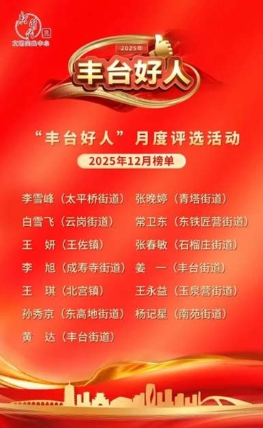 本报讯 2025年12月“丰台好人”月榜人物候选人名单如期而至。来自多个领域的他们,立足平凡岗位,躬身践行使命,用日复一日的坚守诠释责任担当,以润物无声的善举传递人间大爱。