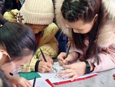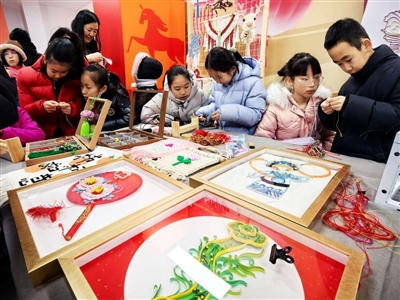 活动现场,三大主题板块各有特色,人气十足。“城门下的非遗时光”区域内,剪纸窗花、中国结编织、仿古拓印等非遗手作项目前座无虚席。孩子们专注地挥舞剪刀、编织红绳、涂抹墨汁,制作出一个个充满创意的专属“福贴”。“这是我第一次做中国结,和其他小朋友一起制作很开心,像过年一样热闹。刚才我还手写了福字日历,想要送给爸爸妈妈,希望一家新年福星高照,事事如意。”8岁的王同学兴奋地说。