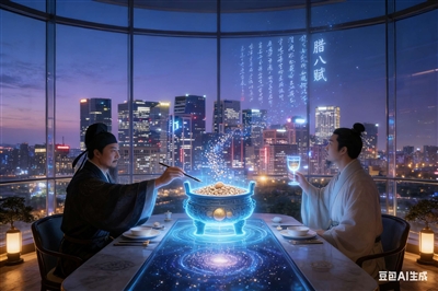 丽泽金融商务区高楼内,苏轼正试图用毛笔“蘸取”全息影像中的一颗虚拟桂圆,而李白则对着空中浮现的、由AI实时生成的《腊八赋》光影诗句,举杯(智能酒杯)惊叹。