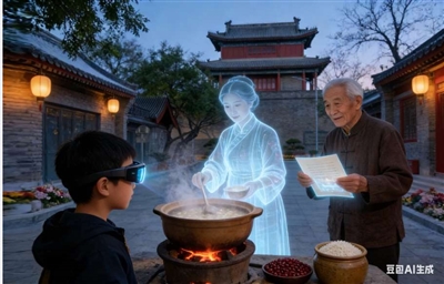 宛平城内,一院内炭火小泥炉上,一口真实的陶锅正咕嘟冒泡。现代家庭的孩子用AR眼镜扫描粥锅,空中浮现出古代家中母亲熬粥的全息幻影,两个时空的“熬粥人”动作同步。虚拟的古代家人通过AR“递来”一封《腊八家书》(光影文字),现代祖父正为孙儿诵读。虚实人物围绕同一锅粥,完成“共煮”与“共食”的仪式。