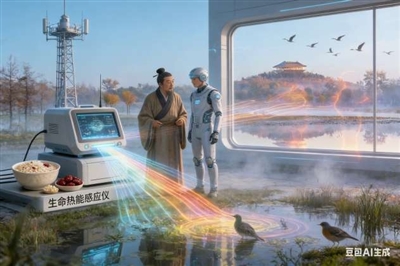 南苑森林湿地公园内,浮现未来生物基站,全景窗外是冬日湿地与飞过的鸟群。古代医者与未来生态学家并肩而立,共同观察光波脉络与窗外鸟群飞行的热感应轮廓重合。一台“生命热能感应仪”将薏米、红枣等粥料转化为彩色光波,注入南苑森林湿地公园内的万物生灵。