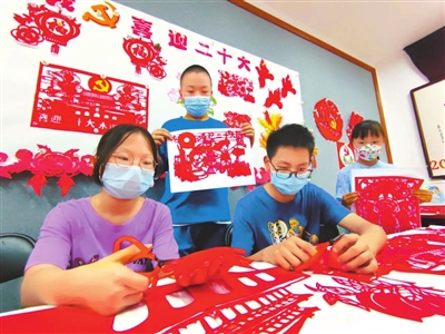 8月10日,南苑街道组织开展“喜迎二十大 强国有我争做好少年”主题剪纸活动。走进街道新时代文明实践“赵玉凤剪纸社”里,孩子们在社区“剪纸达人”赵玉凤的带领下,通过传统剪纸创作出一幅幅主题鲜明的“喜迎二十大”题材作品,展现近年来身边的新变化,以及对祖国的美好祝福、对幸福生活的展望。