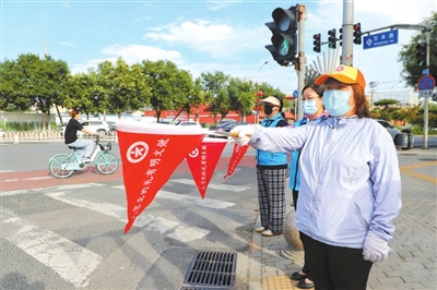 尽管天气炎热,但身穿黄色工作服的文明引导员和身穿“志愿蓝”马甲的志愿者们依然坚守岗位,他们手持文明引导旗,在路口维护交通秩序,引导车辆礼让行人,同时向过往行人宣传交通安全的重要性,针对不文明行为进行劝阻,以实际行动营造安全有序、文明畅通的道路交通环境。