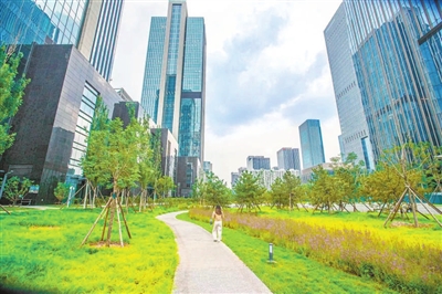 “丽泽规划绿地面积2808亩,包括位于核心区的83亩中心公园,三环及丰草河健康生活带、金中都城遗址文化带、莲花河滨水活力带三条绿化带,34公里生态慢行步道。从丽泽金融商务区任何一栋楼出来,300米内到达一公顷以上绿地,5分钟内到达生态慢行步道,绿色丽泽高质量发展规模初现。”北京丽泽金融商务区工委书记、管委会主任李国龙介绍。