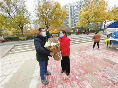 本报讯 11月11日一早,方庄街道办事处的工作人员带着N95口罩、方便面、饮品等防疫及基础物资来到方庄邮政支局,为快递小哥送上“暖心包裹”。