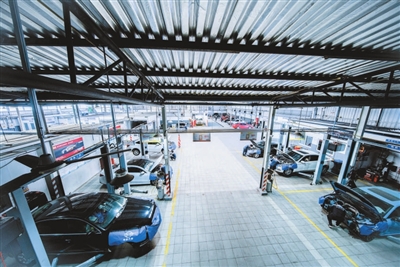 从销售基地向北不远就是坤泽爱车集团的汽修中心,汽修中心占地面积5000余平方米,拥有维修一级资质,4座全封闭式喷漆房、20个打磨车间、10台举升机,日维修承载量达100台车次。