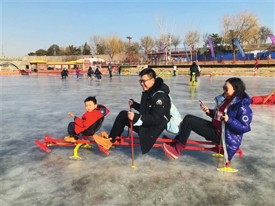 今年1月7日,卢沟晓月冰雪运动嘉年华启动,1.4万平方米的晓月湖公园自然水域,变身1.2万平方米的冰场和2000平方米的雪场。冰封的永定河热闹起来:会滑冰的可以在这里尽情戏冰,不会滑的有老师可教授,纯来玩的可以选择各种冰车、冰上自行车、冰上摇摇乐等设施,还有雪滑梯、雪圈等雪上项目……