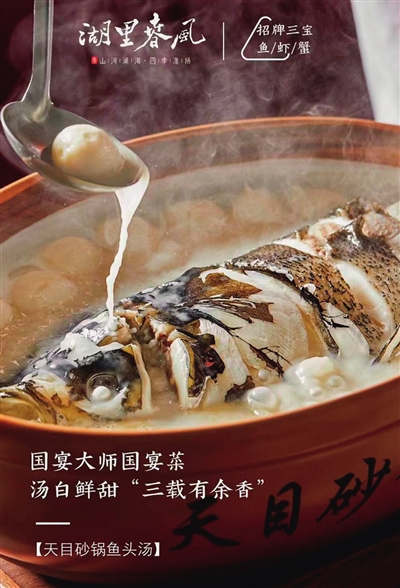 餐厅负责人管青山介绍说,菜品的品质把控十分严格,所有的原材料都要从原产地采购运来,餐厅主打的天目湖鱼头,选用三年以上自然生长大鱼头,每条重达30-40斤,活鱼进京,慢火慢炖,翻滚出浓郁乳白鲜汤,回味鲜美甘香—所谓“三载有余香”。
