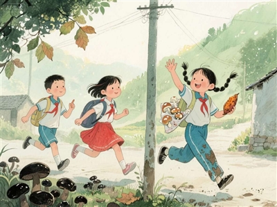 “阿云——快点!”小梅扎着两只羊角辫,在第三根电线杆下跳着招手。她的红裙摆拂过狗尾巴草,惊起几只纺织娘。铁柱从后面追上来,裤脚沾着泥点,嘴里叼着半块烤红薯,含糊不清地嚷着:“语文作业借我抄抄!”