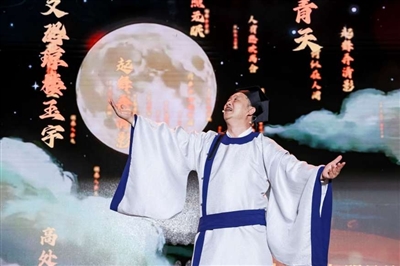 第三篇章“月满家园 灯火相传”展现温情与希望。导演、演员王鹤鸣身着宋代文人服饰,朗诵苏辙《渡桑干》节选,诗人阿紫接力诵读现代诗作《永定河》,二人的配合呼应“苏氏兄弟共赏一轮月”的设计,让历史与现实在诗句中交融。随后,中央广播电视总台播音员王誉博独诵《念奴娇·中秋对月》,中国歌剧舞剧院女高音歌唱家,一级演员伊泓远温情献唱《灯火里的中国》响起……诗、歌作媒,温暖而有力量的表演无不感染在场观众。