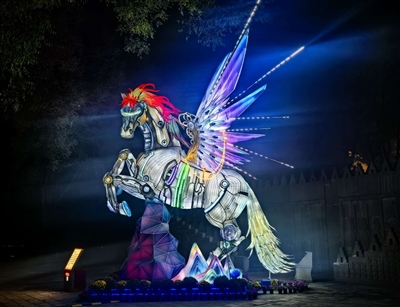 “AI北京”灯组将传统宫灯形制与赛博朋克美学巧妙结合,科技感十足;“宏图伟业·动脉新通”灯组展现“一带一路”在经贸与基建领域的成就;“民心相通·百花齐放”灯组尽显“一带一路”文化交流盛景;“星骥驰光”主题灯组中,机械骏马造型加入机械翅膀,以奔腾之姿寓意中国科技如千里马般日行千里……“白天赏景,夜晚观灯,一步一景,感觉特别棒!”带着父母参观的申乃宽感慨道。非遗彩灯技艺与先进光影科技融合世界公园标志性的微缩景观,为市民游客打造一场跨越时空的光影盛宴。