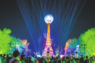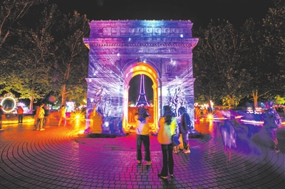 沿主路前行,70组大型彩灯和6万余盏彩灯挂件将园区装点得流光溢彩。在浪漫欧洲区,“凯旋门”与“埃菲尔铁塔”在灯光映射下变幻着色彩。“快门速度还得再调慢些。”来自通州的摄影爱好者李博猫着腰寻找最佳角度,“这些微缩景观在灯光衬托下,比白天的实景还要梦幻。”