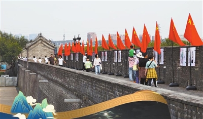 | 10月1日,“焕新”宛平城满是喜庆气息,500面五星红旗迎风飘扬。城墙之上,五星红旗沿城墙一圈整齐矗立,与古老城砖、斑驳弹痕交相辉映。许多游客手持国旗,与这壮观景象合影。 文/记者 蒲长廷 摄/原梓峰 |